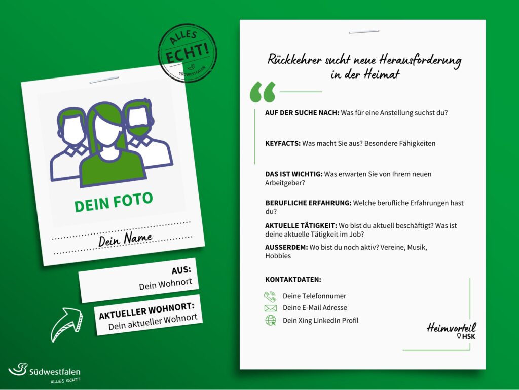 - Kommunale Wirtschaftsförderer im Hochsauerlandkreis, die deinen Steckbrief an passende Unternehmen weiterleiten.